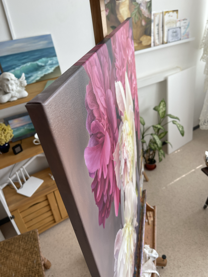 The background of the painting is done in muted tones, which allows the colors to stand out and draws attention to their beauty and detail. The general style of work can be described as realistic, which creates the effect of lightness and naturalness. Together, the pink and white peonies in the painting create a feeling of abundance and lushness, conveying the natural beauty of nature and evoking a sense of peace and admiration in the viewer.