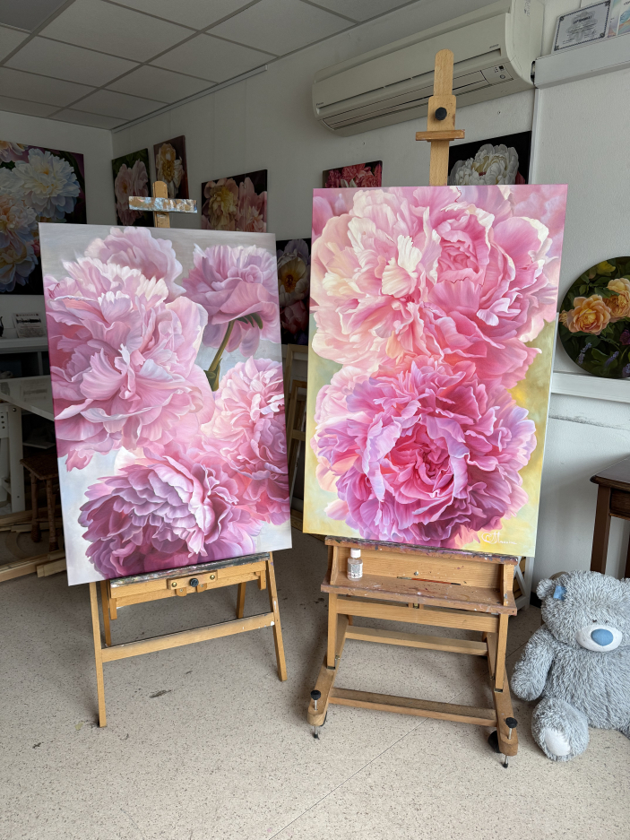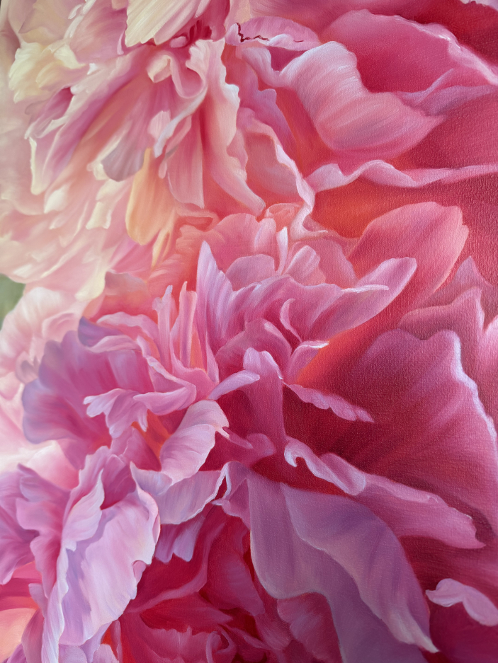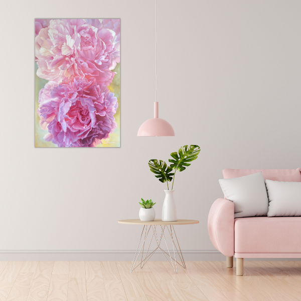 In this painting, the artist explores the harmony of color and light through the image of peonies—symbols of generosity, beauty, and renewal. Soft transitions of pink and pearlescent tones create a sense of depth and fluid movement, as if the flowers are coming to life before the viewer's eyes. The work exudes tranquility and tenderness, embodying the vibrant energy of full bloom. It fills the space with warmth and serenity, creating an atmosphere of inspiration and harmony. Perfect for a contemporary interior striving for lightness, natural elegance, and an emotional response.