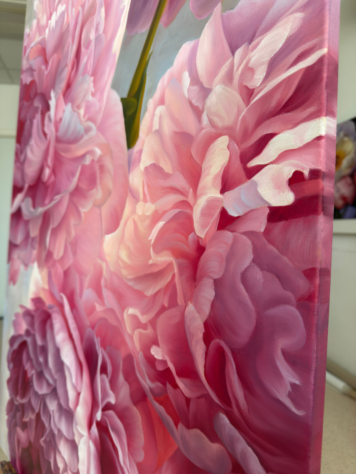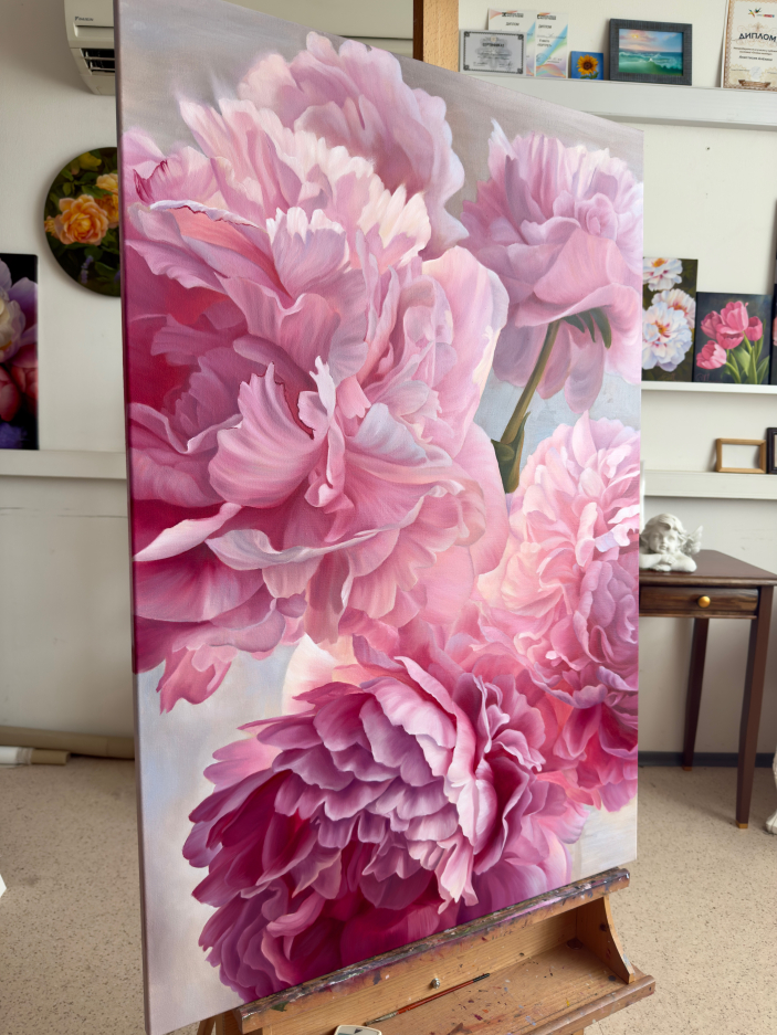 Before us is an oil painting depicting magnificent peonies in various shades of pink. The artist masterfully conveyed the layered petals: from delicate pearly tones to rich crimson, creating a sense of living volume. Each flower seems to breathe, revealing its beauty in the harmony of light and shadow. The background gently dissolves, emphasizing the lushness of the peonies and giving the painting a feeling of lightness and infinity.