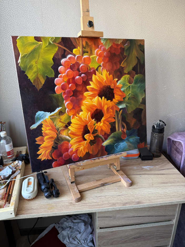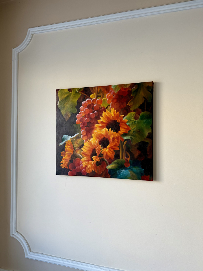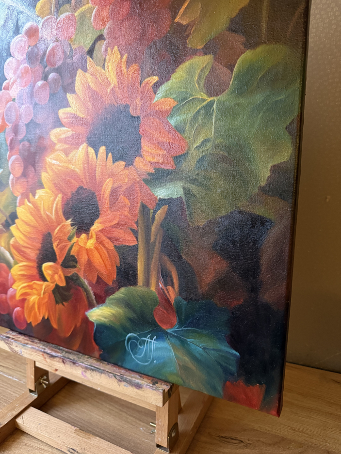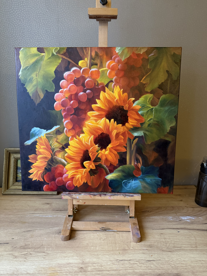 «Осеннее золото» — это ода щедрости природы и свету, рожденному на стыке лета и осени. Подсолнухи, сияющие теплом и силой, переплетаются с тяжелыми гроздьями винограда — символами изобилия, зрелости и полноты жизни.Need more help?