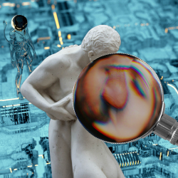 I create my digital artworks using various techniques. This image was created with a 3D designer program. I created a sphere with reflective, distorted surface. Then I put different backgrounds behind the sphere and observed the changes of the surface's structure. I cut out the sphere and use it for different themed montages.
