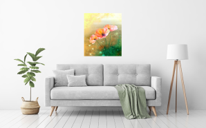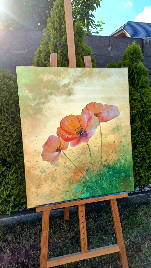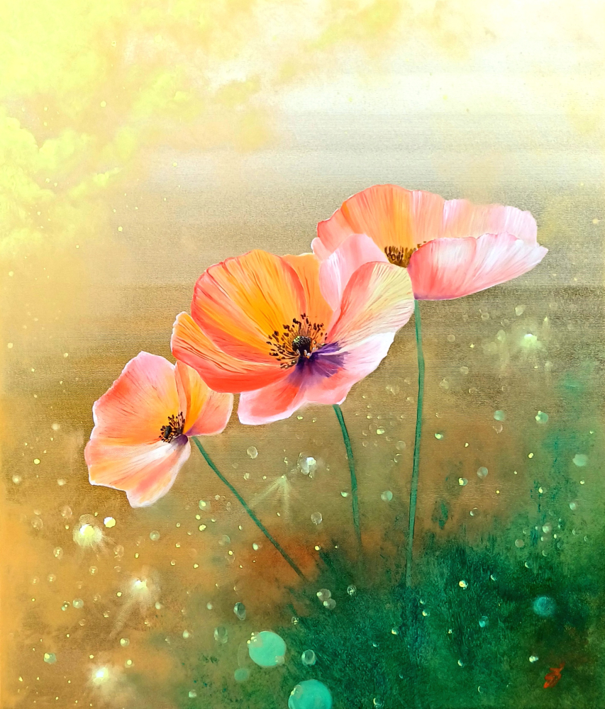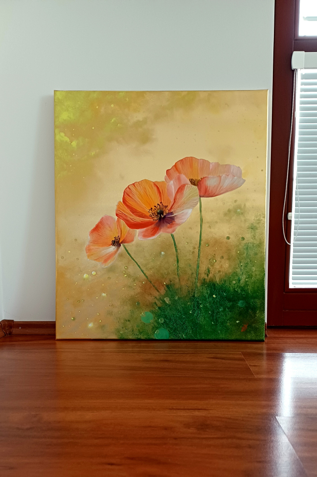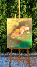 Oil painting of red poppies on the golden canvas. The painting changes as the light falls on it. The vibrant image will be the jewel of your interior.