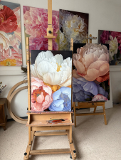 This artwork captures the delicate harmony of peonies in full bloom — white, soft pink, sky blue, and warm golden tones intertwine in a serene floral composition. Each petal is meticulously painted, highlighting the natural elegance, depth, and tranquil power of the flowers. An exquisite and timeless piece that will bring tranquility, beauty, and sophistication to any interior.